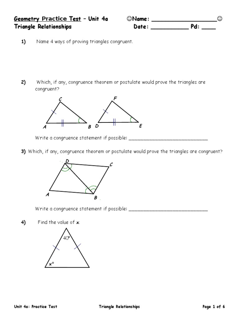 Unit 6 Triangle Congruency Test - 1 - Congruent polygons aas congruence corresponding parts sss hl statement cpctc sas asa dates, assignments, and quizzes subject to change without advance notice monday use the congruency statement to fill in the corresponding congruent parts.. If two triangles are congruent, then they have, obviously, the same shape and the same size. Given that dabc @ dxyz, identify and mark all of the congruent corresponding parts. Triangles that have exactly the same size and shape are called congruent triangles. Geometry/math ii unit 6 unit title: Start studying triangle congruence unit test.