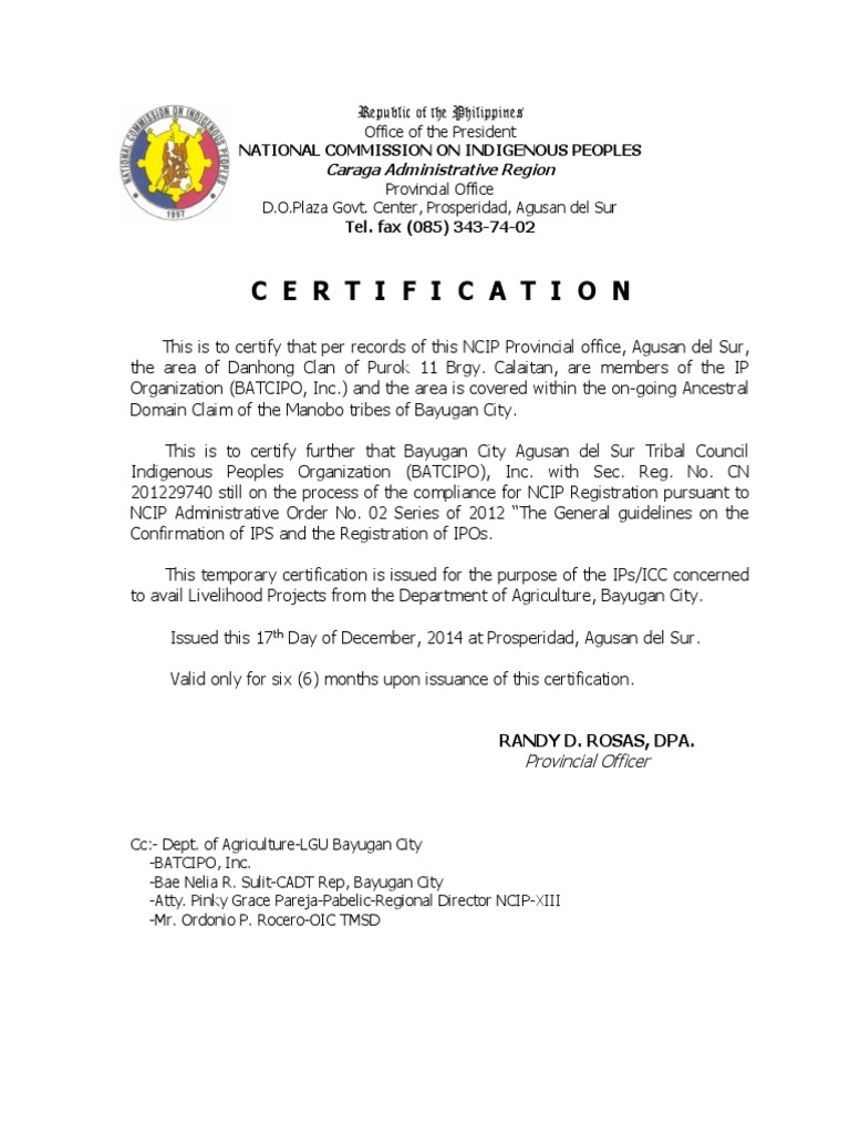 Ncip Certification - Ip Coc Tribal Government And Personhood Government Information / Provided, that no certification shall be issued by the ncip without the free and prior informed and written consent of iccs/ips concerned:. Completing the you call the shots modules 10 and 16 attending a regional immunization workshop or state conference The vfc program is a federal initiative created to help families of children who may not otherwise have access to vaccines by providing free vaccines to doctors who serve them. The national commission on indigenous peoples (ncip) is the agency of the national government of the philippines that is responsible for protecting the rights of the indigenous peoples of the philippines. The national commission on indigenous peoples (ncip) in partnership with the national council for children's television (ncct) the national commission on indigenous peoples (ncip) in partnership with the national council for children's television (ncct), a government agency. Certificate of membership from national commission on indigenous peoples (ncip) or certificate of membership from national commission on muslim filipinos (ncmf).